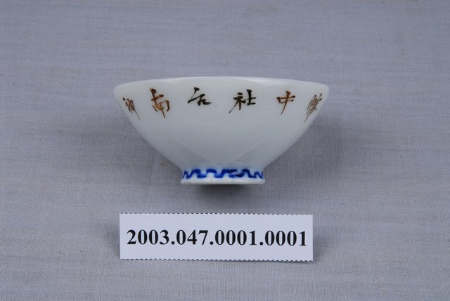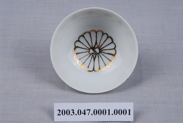 1.本物件為官幣中社臺南神社列格奉告祭紀念盃,盃體完好,盤底有金色日式18瓣菊花紋,外圈同樣寫有「官幣中社台南神社列格奉告祭記念」字樣。