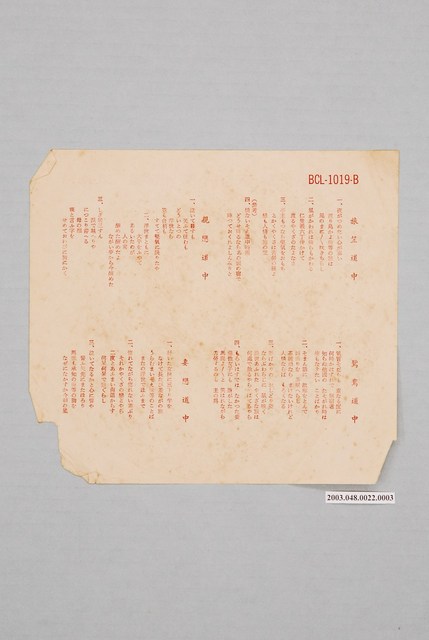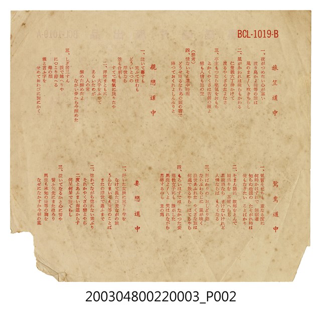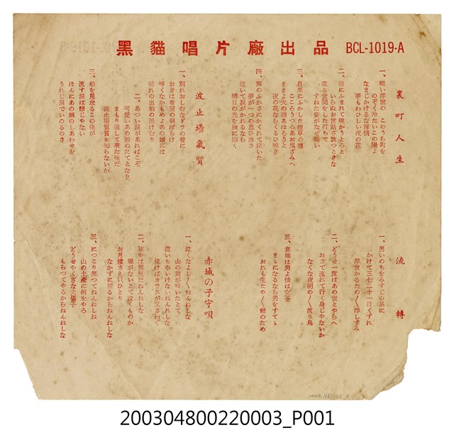 黑貓唱片廠發行編號「BCL-1019」日語歌曲專輯《裏町人生》歌詞單,內容收錄A面:裏町人生(譯:後街人生)、流轉、波止場氣質、赤城の子守唄等4首,B面:旅笠道中、鴛鴦道中、親戀道中、妻戀道中等4首,計8首日語流行歌歌詞。