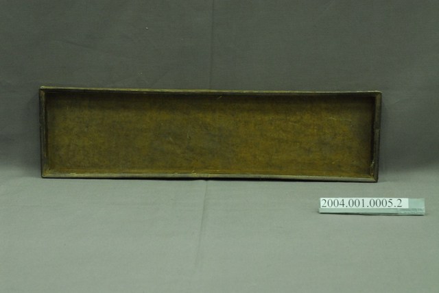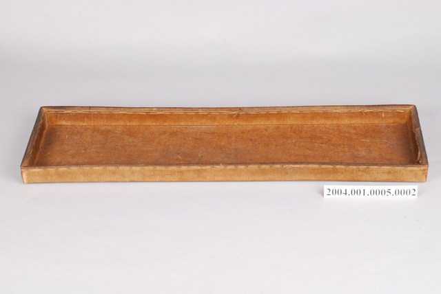 本件為漆皮枕箱之內層托盤,長方形淺托盤。與枕箱主體不同,盒子內外不上漆,也沒有施加任何裝飾,盒身上緣可見縫製皮革之線腳。其功能是用來放置於枕箱內層,可作為置物與隔間之用。
