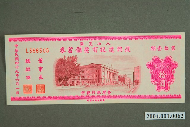2004.001.0062 臺灣銀行發行八七水災區復興建設有獎儲蓄券新臺幣10圓
