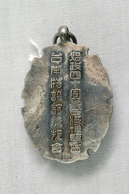 1.本物件為始政40年周年臺灣博覽會臺南特設館後援會章,材質為銀,形狀呈橢圓形,此紀念章正面中間刻有「記念」,左右兩側有刻有花草式樣,下方刻有蝴蝶結,背面中間由右至左刻有「始政40年周年臺灣博覽會臺南特設館後援會」,下方刻有「純銀」字樣。整體氧化變黑。