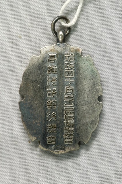 1.本物件為始政40年周年臺灣博覽會高雄特設館後援會章,材質為銀,形狀呈橢圓形,此紀念章正面中間刻有「記念」,其中「記念」字樣泛黃,左右兩側有刻有花草式樣,下方刻有蝴蝶結,正面右側氧化變黑,背面中間由右至左刻有「始政40年周年臺灣博覽會高雄特設館後援會」,下方刻有「純銀」字樣。