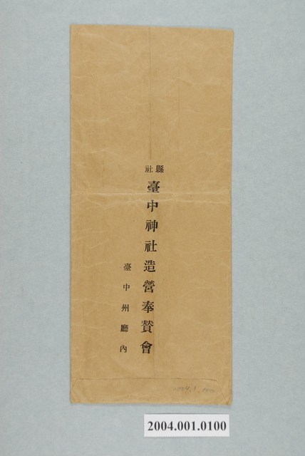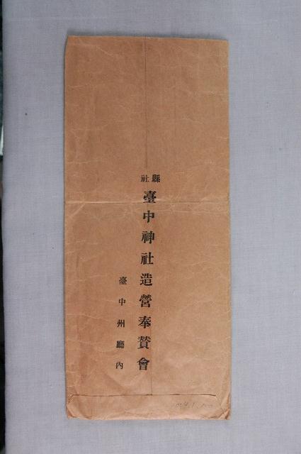 1.本件為北斗郡竹塘庄許學信封,由臺中神社營奉賛會給許學的信封。2.許學,鹿港人,明治25年(1892)生,曾在彰化二林開設太岳醫院而居住在竹塘。3.臺中神社營奉賛會為募建臺中神社的組織。4.北斗郡竹塘庄的行政名稱,存在於1920年至1945年間。