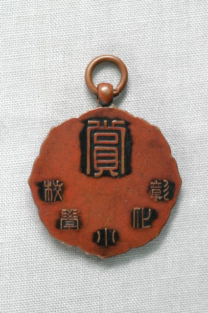 本件為彰化小學校獎賞章,發行年份不詳,金屬材質。正面刻有幾何圖案,集合成「小」字,背面則刻有「賞」與「彰化小學校」字樣。 彰化尋常高等小學校設於明治36年(1903),位於彰化街南郭55番地,昭和16年(1941)改為旭國民學校,戰後廢校。經比對《彰化市管內圖》,戰前校址應位於今彰化市公所附近。