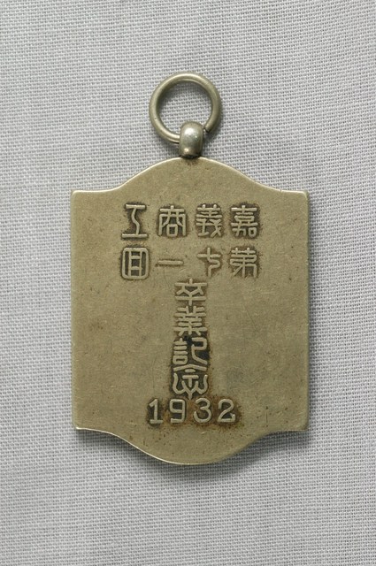 本件為嘉義商工學校第十一屆畢業紀念徽章,發行年份為昭和7年(1932),金屬材質。徽章上方附有圓形穿孔,作吊掛之用途。正面刻有蟬、月桂葉、校舍、山、燈等圖樣,背面刻有「嘉義商工學校第十一回卒業記念 」、「1932」字樣。 該校歷史最早可上溯至明治38年(1905)設置於嘉義公學校的實業科,為2年制,招收公學校畢業生。大正8年(1919)臺灣教育令公布,將實業科獨立為公立簡易實業學校,該校遂獨立為嘉義簡易商業學校,但仍附設於公學校內。大正10 年(1921),增設工科,改為簡易商工學校。大正11年(1922)第二次臺灣教育令發布,將職業教育分為「實業學校」及「實業補習學校」兩類,該校遂改制為嘉義商工補習學校,為3年制實業補習學校,遷出公學校至嘉義街300番地。昭和7年(1932年),改名為嘉義商工專修學校;1940年學校規模擴大,商科及工科分校,該校獨立為臺南州嘉義專修商業學校,遷校至南門町,為今日國立嘉義高級工業職業學校。