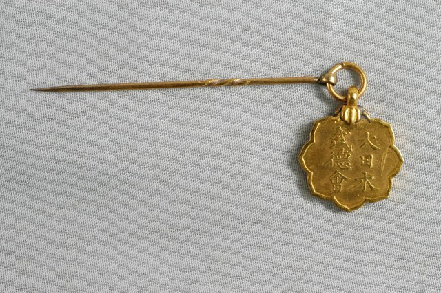 本件圓形菊狀金屬製大日本武德會正會員之章為金黃色菊花形狀,帶有穿繩紐,穿著一個圓形金屬環,環上掛著一支金屬長針。金屬章為菊花狀,正面有「武德」2字及弓、箭等紋樣,後面有光芒圖案。背面有「大日本武德會」等字樣,保存完整。