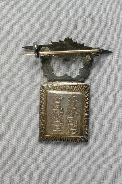 1.本件為大日本武德會褒章,正面以橫尖形的太陽輝飾連結一串梅花垂接四方形的章記主體,此章記以弓及箭上寫「武德」二字構成,保存狀況良好。2.大日本武德會是在第二次世界大戰前的日本以振興、教育、彰顯武術、武道為目的而設立的財團法人,以涵養武德及為此而獎勵武術,並順勢振興日本國民士氣為目的。該組織成立於明治28年(1895年)4月17日,於昭和21年(1946年)10月31日解散。