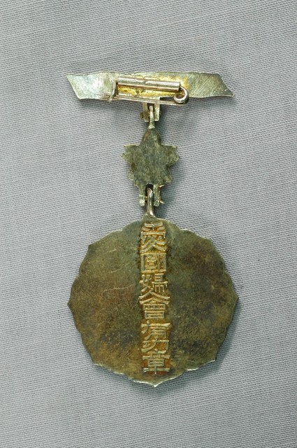 本文物為愛國婦人會參等有功附加章之紀念章,勳章方面,以銀色花瓣為形狀,紀念章裡兩串花穗間的錨、星星為日本海軍、陸軍意象,別針下方則附櫻花綴飾。背面寫有「愛國婦人會有功章」。勳章表面已有些許生鏽與刮痕。