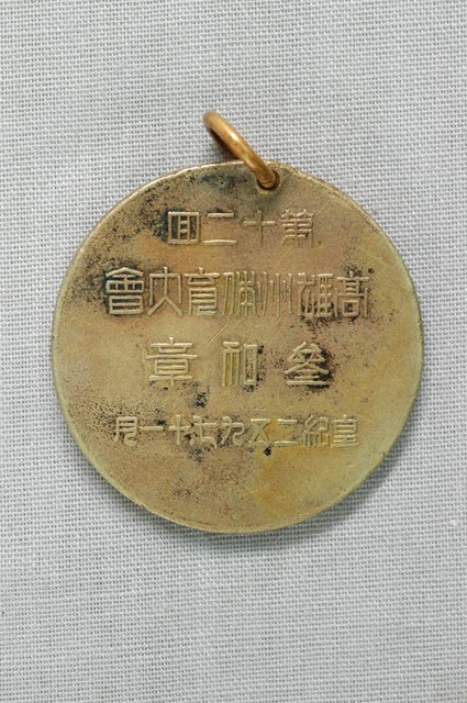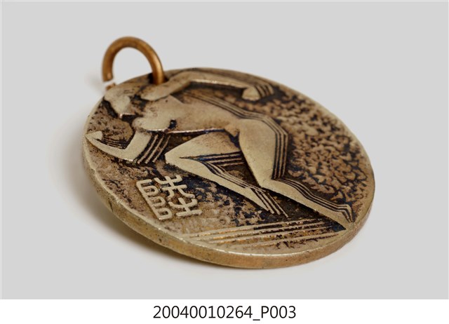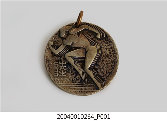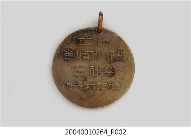 本物件為昭和12年(1937)第12回高雄州體育大會參加章,金屬材質。紀念章正面有1人做跑步姿態圖樣,左下方有「陸」字樣;背面有第十二回高雄州體育大會參加章、「皇紀二五九七.十一月」字樣。本物件表面有鏽蝕現象。
