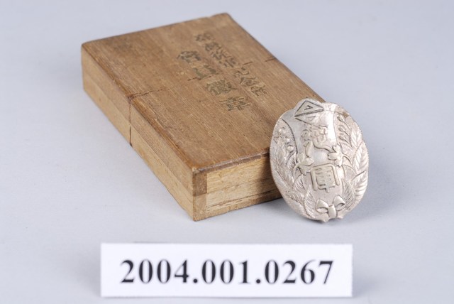1.本文物為臺灣從軍記念徽章與紀念盒,紀念盒為木製,盒蓋上方寫有「臺灣從軍記念會會員徽章」。徽章為銀色,上方寫有「臺」的標示,以及「從軍」的字樣,字的兩邊有花飾。本文物為參與從軍而獲得之紀念。