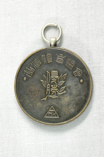 本件為臺灣體育協會頒發之優勝徽章,材質為金屬,圓形。正面有「譽」字樣及人物、旭日、樹林浮雕圖案,背面則有「臺灣體育協會」、「優勝」及體育協會會徽。 大正9年(1920)臺灣體育協會成立,是臺灣總督府的外圍組織,協會內再分為網球部、棒球部、田徑部、相撲部、球技部、水泳部等項目,並且在臺北、新竹、臺中、嘉義、臺南、臺東、花蓮港、澎湖成立支部,支部下設有各分會。
