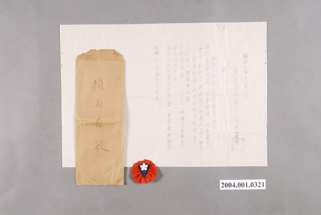 本件為昭和7年(1932)臺灣體育協會嘉義支部頒發之會員章,包括協會寄贈信函以及信封。根據信封資訊,原持有人為嘉義詩人賴雨若(1878—1941)。賴雨若,號壺仙,1899年畢業於嘉義公學校,任臺南地方檢查院雇員,1904年為總督府法院通譯,次年普通文官考試合格,兼任法院書記。1907年留學日本,先後就讀中央大學法律科、明治大學高等研究科,並通過辯護士考試,取得日本律師資格。返歸嘉義開業,