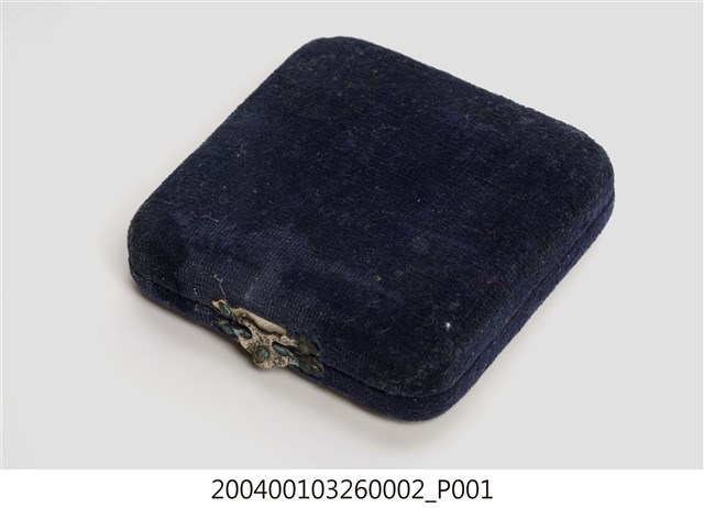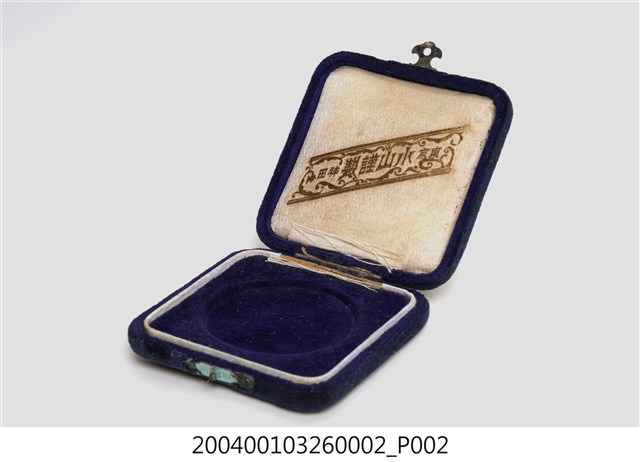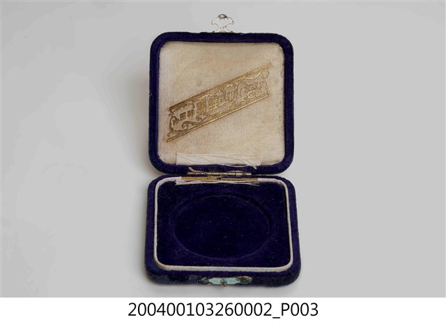 本件為大正15年(1926)臺灣全島中等學校庭球大會參加紀念章附盒,材質應為木製,外邊以絨布包覆,內部上、下皆附有軟襯墊,上蓋內部有「東京 水山謹製 神田」字樣。 本件為典藏號「2004.001.0326」部件。
