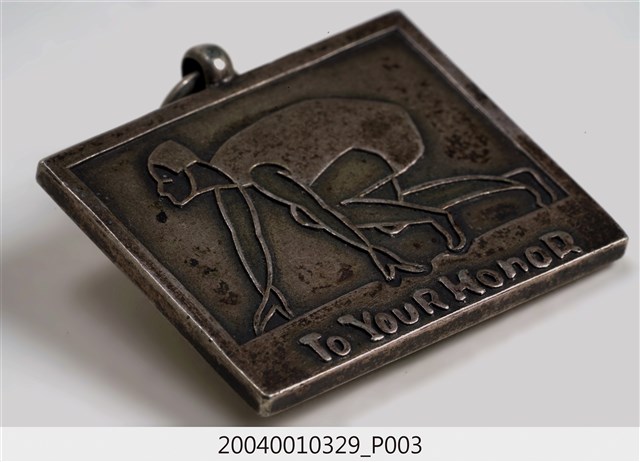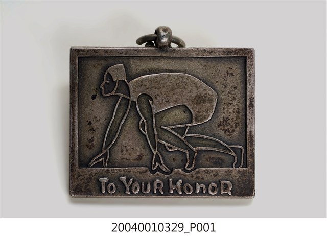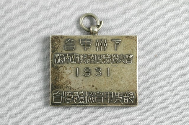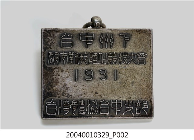 本件為昭和6年(1931)臺中州下郡市對抗陸上競技大會紀念章,金屬材質,四邊形。正面為人物起跑浮雕式樣,並刻有「TO YOUR HONOR」字樣,背面則有「台中州下 郡市對抗陸上競技大會」、「1931」、「台灣體協台中支部」字樣。 本紀念章所指涉之事件為昭和6年(1931)2月15日舉辦之臺中州下郡市對抗陸上競技(田徑)大會,地點於臺中市水源地廣場,分為小、公學校組以及一般市民對抗3類。