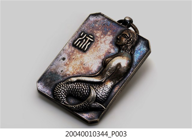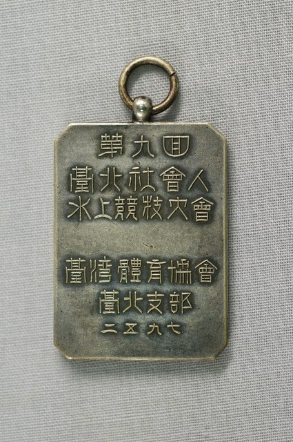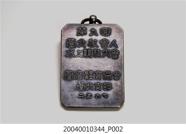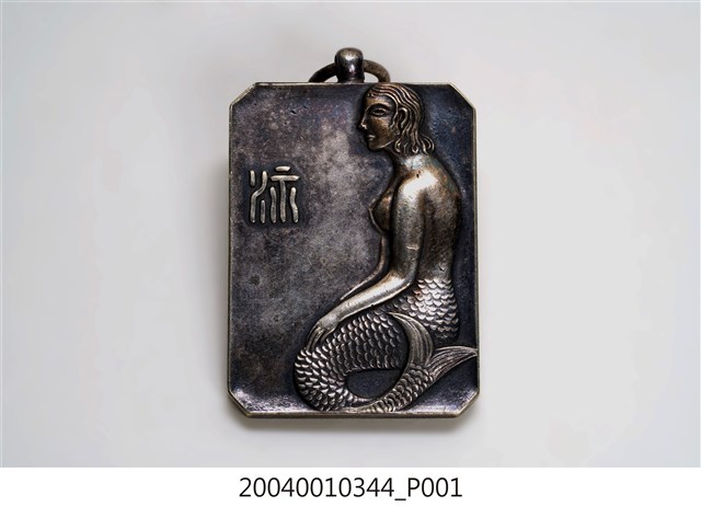本件為昭和12年(1937)台北社會人水上競技大會紀念章,金屬材質。正面有人魚之浮雕圖案,並刻有「泳」字樣,背面則有「第九回台北社會人水上競技大會」、「 臺灣體育協會台北支部」、「二五九七」等字樣。 本物件所涉及之事件應為昭和12年(1937)9月19日,由臺灣體育協會臺北支部舉辦之第九屆社會人水上競技大會,地點於臺北市東門市營游泳池。