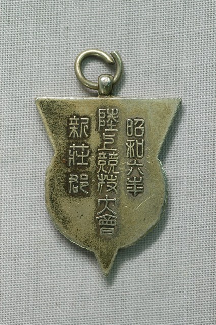 本件為昭和6年(1931)新莊郡陸上競技大會獎賞徽章,金屬材質。正面有葉片紋路及「賞」字樣,背面有「昭和六年 陸上競技大會 新莊郡」等字樣。