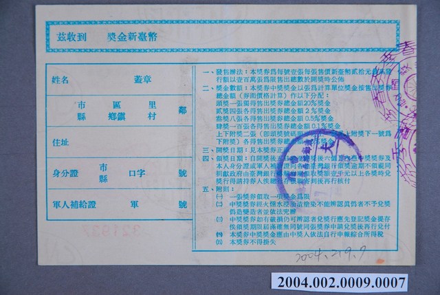 四季券,橫式設計。愛國獎券,開獎日期中華民國五十八年五月一日,臺灣省政府委託臺灣銀行發行,新台幣20圓,中華民國五十八年春季券,編號321937。彌勒、青銅器、燈籠圖。