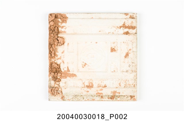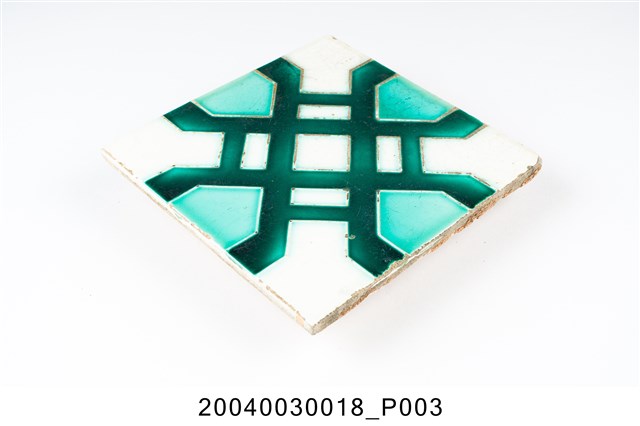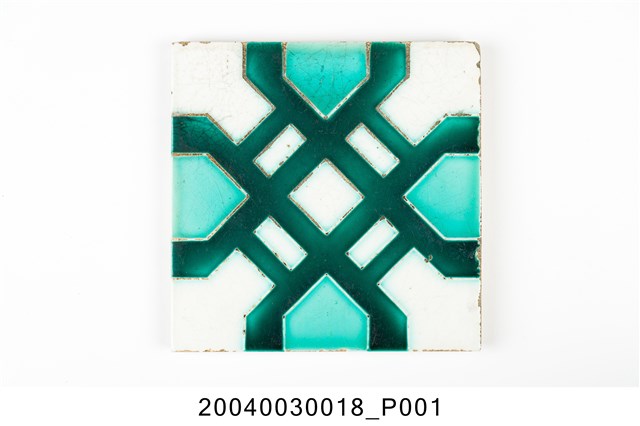 本件磁磚底色為白色,以綠色線條構成由中心向外層層配置幾何圖案,中心層為菱形,往對角線方向形成長方形,並往四邊構成五邊形,五邊形內著淺綠色料。本件磁磚圖案係仿照英國維多利亞磁磚構圖。本件磁磚背面有製造公司商標,為S纏繞H字組成,以及「THE H.S. TILE WORKS」、「SPECIAL MAKE P 4 1」字樣,是由日本名古屋的佐治TILE公司所製造。磁磚背面邊緣黏附灰泥,與館藏號2004.003.0019-0020為相同產品。