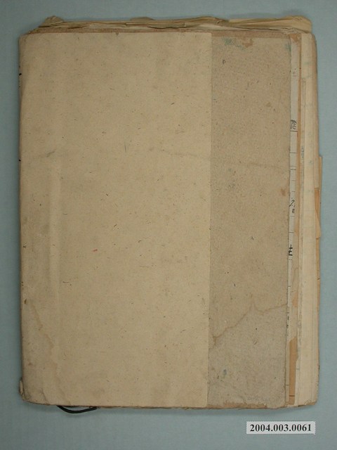 1.此件為民國37年度收錄施行的稅務關係資料冊,內容應是有關於稅務的法條法規等的資料集結。該文件冊裝訂得頗為簡易,內頁有許多超出封面的狀況,並且裝訂的極為不整。封面部分以黑色墨水毛筆書寫「稅務關係」、「民國卅七年度」字樣,年度的字樣旁貼有白色紙條,推測應是為蓋過修改的文字所致。裝訂方式推測有以黑色繩條穿孔繫綁後,再簡易黏貼一道書背而成,書背上以黑色墨水毛筆書寫「稅務關係文件綴」、「民國卅七年度」字樣;從露出的部分內頁來看,內容應該包含報紙的剪貼資料與文件資料的集結。因年代些許久遠,整體呈現出泛黃、破損、污漬、凹折等狀態。