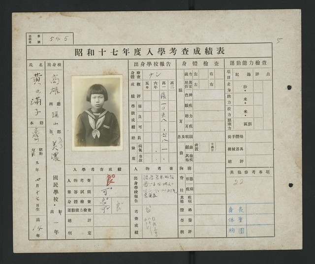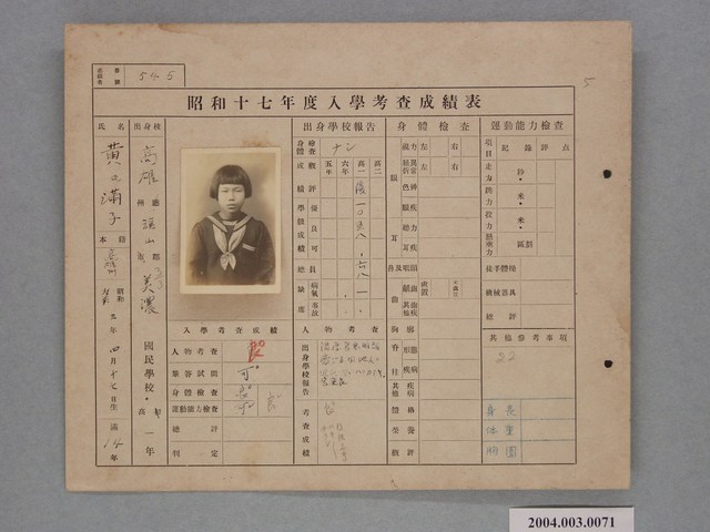 2004.003.0071 昭和十七年黃滿子入學考查成績表