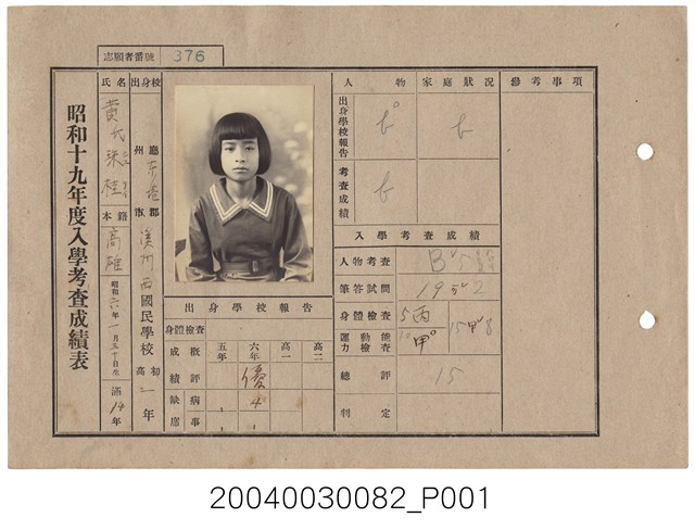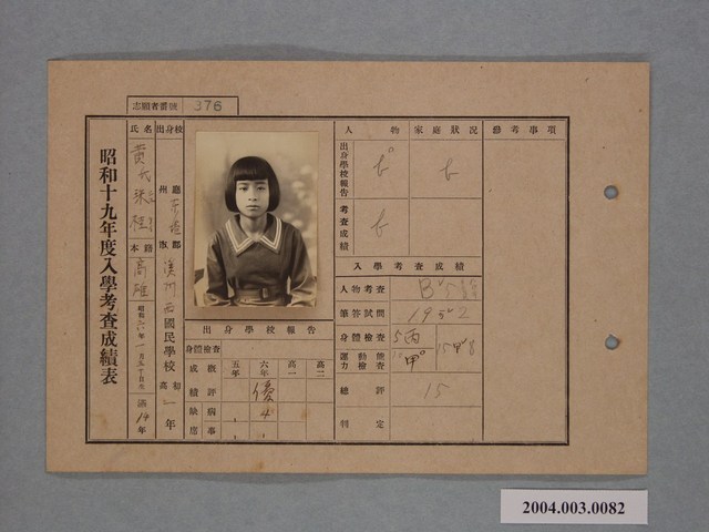 2004.003.0082 昭和十九年黃珠桂入學考查成績表