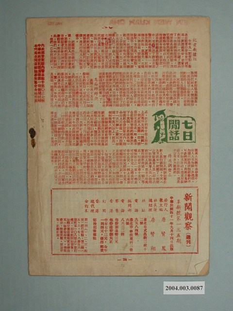 此物件為《新聞觀察》革新號第135期,出版日期為1952年9月14日,封面羅列內容要目,計有 〈籃球魔術家哈林英雄傳〉、〈主婦們滿意了(紐約航信〉、〈葉公超•半遮面〉、〈防空洞出頂(釜山航信)〉、〈王季徵險渡美人關〉、〈美其名曰善後〉(華府航信)、〈隻手擎天•獨臂將軍彼得標依〉、〈隊長是將才•希吾士盤球最驚人〉、〈釣射聖手•鵞子他譚傳奇篇〉、〈子夜歌•異國佳人落溷記〉、〈七男追逐焦鴻英〉、〈太保踰東垣•血洗海棠紅〉、〈六代豪華春去也•金玉飛滿堂〉、〈慧劍斬情絲•赤崁樓報販啼痕錄〉、〈燈光亮處•亂世佳人斷腸花〉、〈乳燕飛•人面桃花琵琶行〉、〈瘋郎娶少女離奇婚變案〉、〈慈母心•阿飛偷香案插曲〉、〈記者公會冷戰內幕〉、〈花花公子行腳〉、〈還君再嫁身家姬紅杏武〉等。 此《新聞觀察》為一評論性質的雜誌,此雜誌創刊於1949年,主要刊載內容為對時局的評論以及報導,但也刊有許多藝文相關的內容。另此刊物在唐賢翔作為發行人的1954年,受到民眾檢舉為「赤黃黑」的刊物因而遭到停刊。為1954年「文化清潔運動」中受到懲處的書刊之一。 中國文藝協會延續1953年蔣中正所發表的〈民生主義育樂兩篇補述〉中提及的「剷除赤色的毒與黃色的害」號召,於是在1954年發起「文化清潔運動」的審查活動。其中眾多刊物受到檢舉,理由為「赤色的毒」、「黃色的害」、「黑色的罪」這樣模糊不清的規範,在政府主動搜查、民間匿名檢舉下,文壇受到相當影響。
