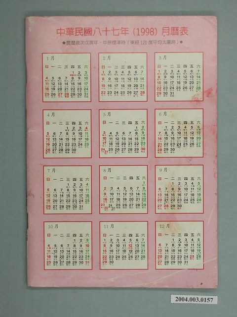 1.本件為「民國八十七年歲次戊寅《中國民曆》」,右翻騎縫釘,封面四邊有磨損現象,褐斑明顯。2.就封面可分上、中、下三個部分討論,上方是本書名稱;中間放置張文英與張博雅的市長交接彩色照片,下方說明書本來源是嘉義市長張博雅敬贈。3.此本農民曆是工商業用公版,作為廣告之用。封底是該年的日曆。