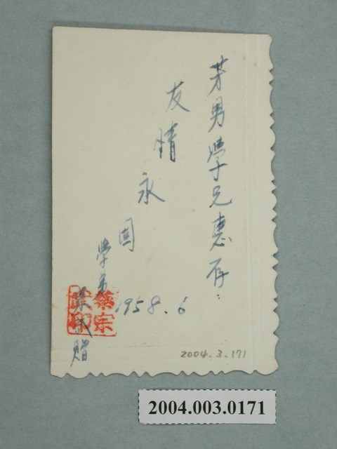 本物件為男子之黑白半身獨照。男子頭戴有中華民國國徽的盤帽,著制服,微向前傾,望向遠方。底色為黑色,下有「影家高級攝影」白色字樣,左、下方有飾邊。照片背面書有「芳男學兄惠存:友情永固 學弟宗武贈」、「1958、6」,並蓋有「蔡宗武印」章。