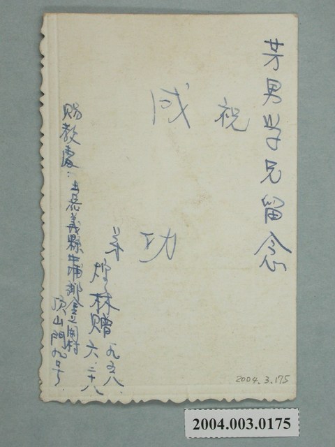本物件為男子之黑白半身獨照。男子髮右旁分,微側身體,望向遠方,著襯衫,底色為黑色,右、下側有飾邊。照片背面書有「芳男學兄留念 祝 成功 弟 煌林贈 一九五八、六、二十八」、「賜教處:嘉義縣中埔鄉金蘭村頂山門50號」。