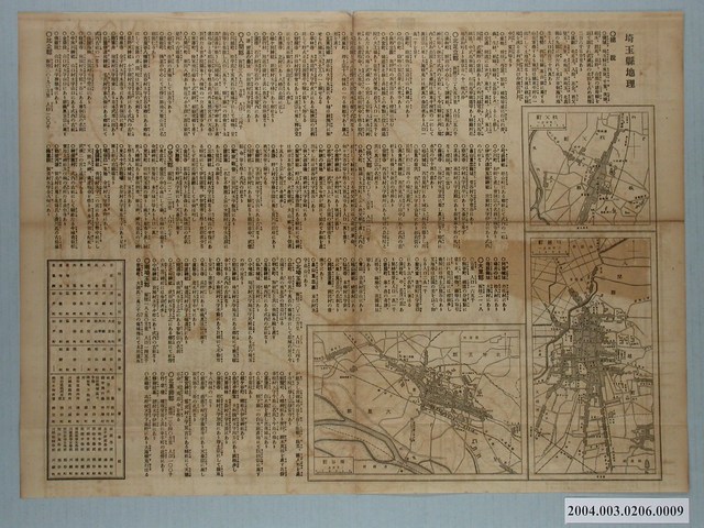 〈埼玉縣全圖〉為《最新詳密金刺分縣圖》套圖之一,比例尺二十五萬分一,著作者木崎盛政,發行者金刺源次,發行所金刺製圖部,印刷者田村茂太郎,1919年5月15日訂正版。