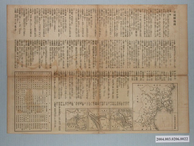 〈宮城縣全圖〉為《最新詳密金刺分縣圖》套圖之一,比例尺三十五萬分一,著作者木崎盛政,發行者金刺源次,發行所金刺製圖部,印刷者田村茂太郎,1918年8月20日訂正版。