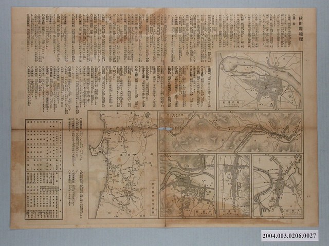 〈秋田縣全圖〉為《最新詳密金刺分縣圖》套圖之一,比例尺三十七萬分一,著作者木崎盛政,發行者金刺源次,發行所金刺製圖部,印刷者田村茂太郎,1919年3月20日訂正版。