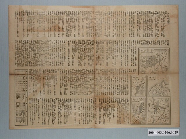 〈石川縣全圖〉為《最新詳密金刺分縣圖》套圖之一,比例尺二十五萬分一,著作者木崎盛政,發行者金刺源次,發行所金刺製圖部,印刷者田村茂太郎,1918年8月1日訂正版。