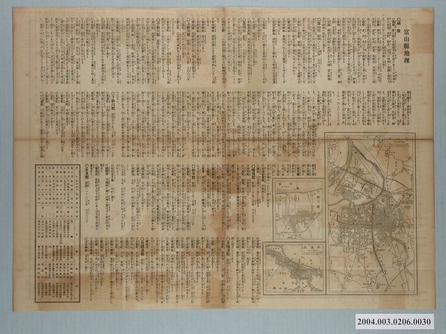 〈富山縣全圖〉為《最新詳密金刺分縣圖》套圖之一,比例尺二十五萬分一,著作者木崎盛政,發行者金刺源次,發行所金刺製圖部,印刷者田村茂太郎,1919年5月5日訂正版。