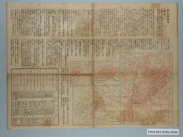 本圖測繪範圍為日本熊本縣各郡市。功能分類為行政區域圖,內容包含政區邊界(各府縣、郡市、維新前諸國)及治所,官署、聚落、師團司令部、學校、神社、鐵路、公路等。地形描繪使用暈滃法。有經緯度,地圖方向指北。附圖有管內里程圖、主要城市市街圖(熊本、八代等)。背面簡介地理概況。