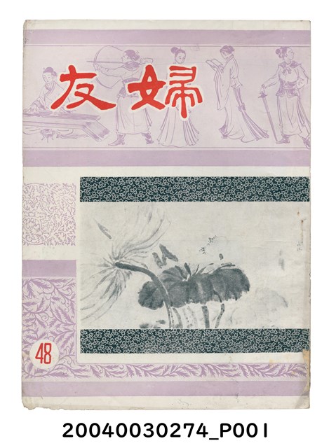 1.本物件為《婦友》雜誌第48期,封面為蔣宋美齡繪水墨畫,封底為夏祖明繪《蓓蒂與獅頭人(9)》,刊物售價為新台幣3元,港幣6角,為內政部雜誌登記證內警台誌字第471號,台灣省郵政管理局執照第681號。本期內容有社論「堅強心理 沉著應戰」、論著「阿拉伯國家自行休戰、養女問題的事實與法律觀」、談夏季孩子的睡眠問題、床邊故事「狗洗澡的麻煩、四瓶果醬」、藝文「慈母心、災荒的記憶、幽蘭」等。2. 本刊物內容以民族性、推進婦女工作、家庭、 兒童等為主,有專欄「女青年園地」主要以女青年以及各校女學生投稿為主。3.《婦友》月刊是國民黨中央委員會婦女工作會(以下簡稱婦工會)發行的綜合性刊物,於1954年10月10日創刊,歷時43年,1990年改為雙月刊,1997年停刊。婦工會在國民黨黨務中是負責「掌理婦女運動工作」,《婦友》成為其內部組織對外界宣傳的書面文字媒介,目的在於「以文教指導婦女人生」。