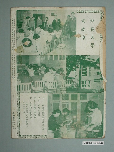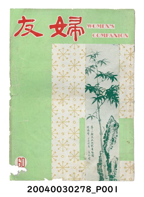 1.本物件為《婦友》雜誌第60期,封面為蔣宋美齡繪水墨畫,並寫有本期刊英文名字《WOMEN'S COMPANI》,封底為《師範大學家政系》主題照片與說明,刊物售價為新台幣3元,港幣6角,為內政部雜誌登記證內警台誌字第471號,台灣省郵政管理局執照第681號。本件的目錄頁佚失,本期部分內容有論幸福家庭、女性與詞、床邊故事「巨人的妻子」以及女青年園地等題目。2. 本刊物內容以民族性、推進婦女工作、家庭、 兒童等為主,有專欄「女青年園地」主要以女青年以及各校女學生投稿為主。3.《婦友》月刊是國民黨中央委員會婦女工作會(以下簡稱婦工會)發行的綜合性刊物,於1954年10月10日創刊,歷時43年,1990年改為雙月刊,1997年停刊。婦工會在國民黨黨務中是負責「掌理婦女運動工作」,《婦友》成為其內部組織對外界宣傳的書面文字媒介,目的在於「以文教指導婦女人生」。
