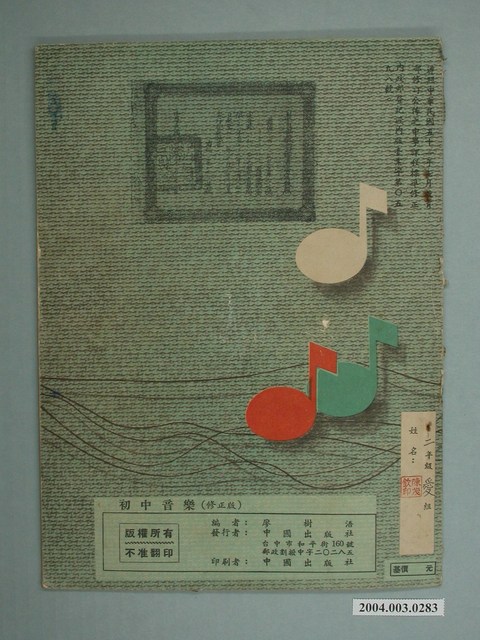 本件為廖樹浯編著、教育部審定之《初中音樂》修正版,冊次為第3冊,為戰後初級中學音樂教科書。本書由中國出版社印行,發行時間不詳,根據書中「本書遵照中華民國五十一年七月教育部修正公布之初級中學音樂課程標準改編修訂而成」字樣,推測為1962年發行版本。內容包括歌曲、基本練習、樂理、欣賞等4部分。書籍背面寫有:持有人「陳茂欽」姓名字樣。
