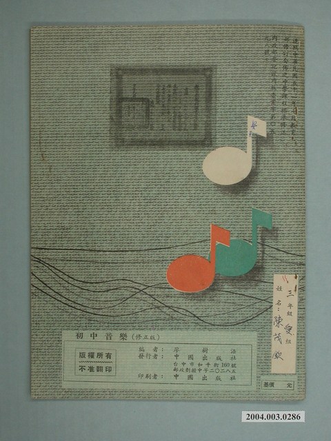 本件為廖樹浯編著、教育部審定之《初中音樂》修正版,冊次為第3冊,為戰後初級中學音樂教科書。本書由中國出版社印行,發行時間不詳,根據書中「本書遵照中華民國五十一年七月教育部修正公布之初級中學音樂課程標準改編修訂而成」字樣,推測為1962年發行版本。內容包括歌曲、基本練習、樂理、欣賞等4部分。書籍背面寫有:持有人「陳茂欽」姓名字樣。