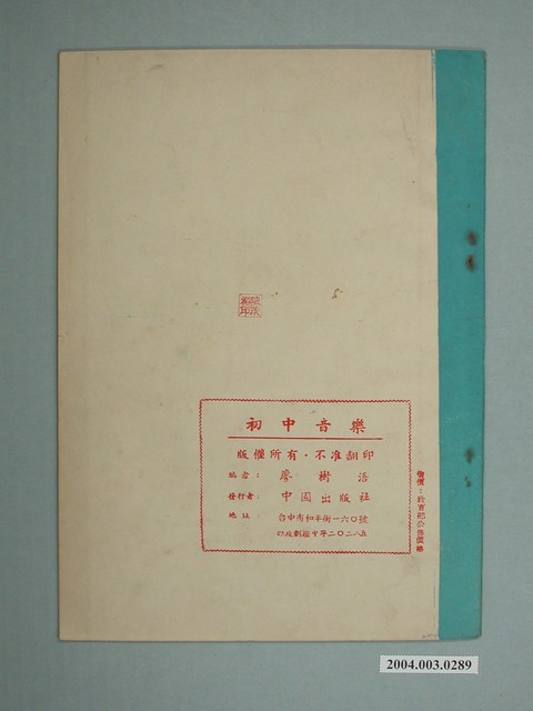 本件為廖樹浯編著、教育部審定之《初中音樂》,冊次為第5冊,發行時間不詳,由中國出版社印行,為戰後初級中學音樂教科書,書中的〈編輯大意〉指出:「本書特重調號少(三個以內)的中外名曲、世界名曲的歌詞,大多重新創作,以文字淺顯、音韻諧和、歌唱時流利順口,且能發揚愛國精神者為主」,內容包括歌曲、基本練習、樂理、欣賞等4部分。書籍正、背面印有持有人「陳茂欽」姓名印章。