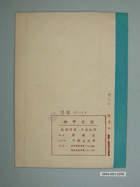 本件為廖樹浯編著、教育部審定之《初中音樂》,冊次為第6冊,發行時間不詳,由中國出版社印行,為戰後初級中學音樂教科書,書中的〈編輯大意〉指出:「本書特重調號少(三個以內)的中外名曲、世界名曲的歌詞,大多重新創作,以文字淺顯、音韻諧和、歌唱時流利順口,且能發揚愛國精神者為主」,內容包括歌曲、基本練習、樂理、欣賞等4部分。書籍正、背面印有持有人「陳茂欽」姓名印章。