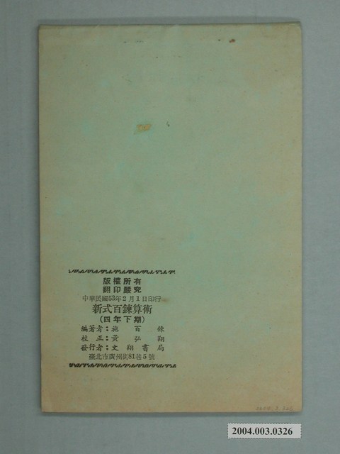本文物為民國53年2月印行《新式百鍊算數(四年下期)》教師用解答批閱本。編著者為施百鍊,臺北文翔書局發行出版。