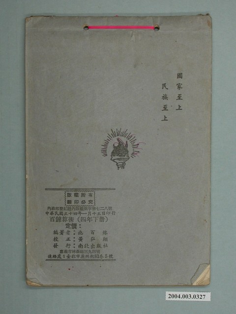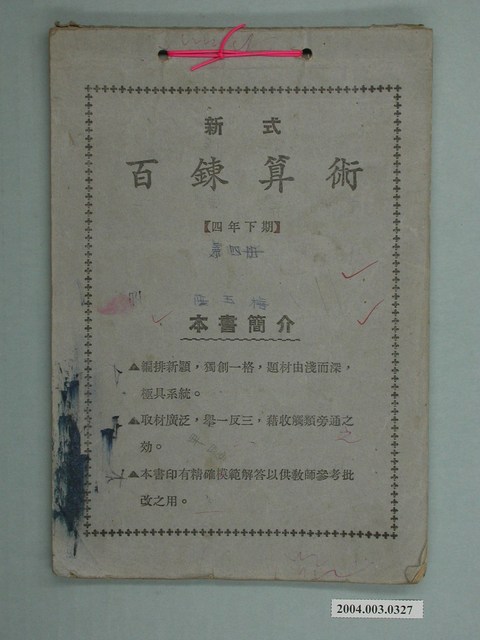 2004.003.0327 施百鍊《新式百鍊算術(四年下期)》課本