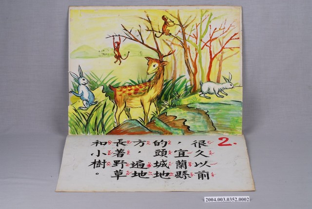 本件為嘉義市宣信國民小學社會課第三冊第十二課教具圖卡,供二年級上學期用,課名為「墾荒」。圖卡兩面皆有印刷,正面印有:「鄉賢故事 墾荒(二)」字樣;背面則有1張彩色圖畫,描繪梅花鹿、猴、兔等動物,圖畫下方有「2. 很久以前,宜蘭縣的頭城地方,遍地長著野草與小樹」字樣,字旁皆標註注音符號。此件教具對應於國立編譯館依據民國64年(1975)11月公布的「國民小學社會課程標準」,統一編輯、發行之國小社會課本,課程單元為「鄉賢故事」,課名則為「墾荒」,內容包含吳沙開墾宜蘭的歷史故事。