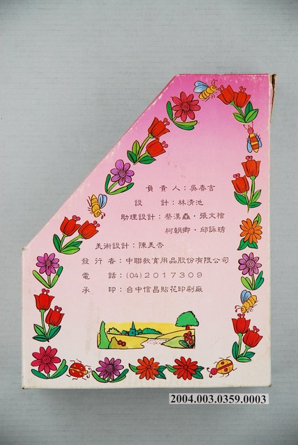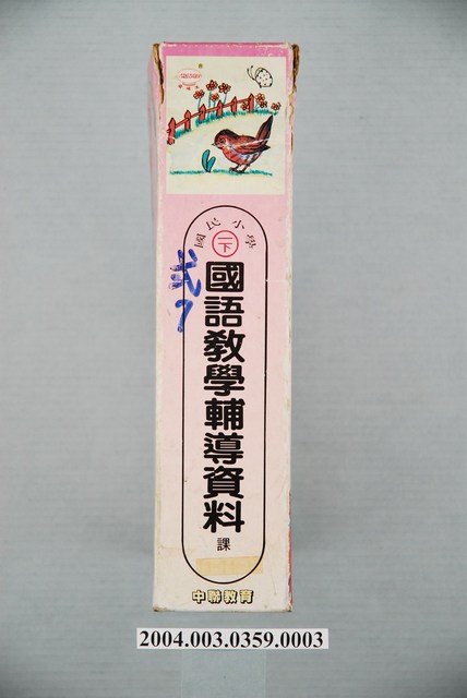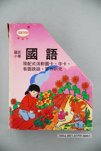 本文物為裝教具硬殼,紙本、彩色印刷,書背上方有禽鳥、花卉、蝴蝶圖案,有「國民小學一下,國語教學輔導資料課」、「中聯教育」。正面有文字「國語搭配式活動圖卡、字卡、看圖說話、資料研究」,有一小女孩和兔子在耙田耕作插圖。背面「負責人:吳春吉,設計:林清池,助理設計:蔡漢灥、張文檜、柯朝卿、邱詠琇。美術設計:陳美杏。發行者:中聯教育用具股份有限公司。電話:(04)2017309,承印:臺中信昌貼花印刷廠。