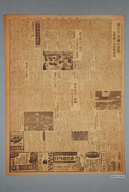 此物件為1942年4月10日出版的《夕刊興南新聞》第4029號,物件篇幅為單張單面,共計1版(第1版)。物件內容要目計有:〈俘虜總數八萬二千 鹵獲品も驚異的數字を示す 蘭印方面の大戰果〉、〈尨大な對日戰備を物語る〉、〈快心の成果を收む 長驅アキヤブ港を襲擊〉、〈一日に二十粁突破完全に既定コ-スを遂行 マレ-作戰軍主任參謀談(三)〉、〈燦たり不滅の偉勳 九軍神の合同葬盛儀〉、〈武人最高の榮譽九軍神遺族の感激談〉、〈擧島、貯蓄に精勵 中島財務局長呼掛く〉等。 興南新聞社,前身為臺灣新民報社,為日治時期臺灣人創刊的重要報紙之一。在前身《臺灣民報》時期,便自詡為「臺灣人唯一的言論機關」,在當時的政治運動脈絡裡有重要地位。後在1930年,《臺灣民報》更名為《臺灣新民報》,並於1932年改為日刊發售。1941年,在日本帝國發動南向政策的時局下,《臺灣新民報》改名為《興南新聞》,同時批判政府的言論趨緩。之後,《興南新聞》與其他5份報刊在1944年被臺灣總督府整併為《臺灣新報》。 日治時期的報紙刊行十分困難。日本政府於1883年 發表「新聞紙條例」,對國內報章出版以「許可制」、「保證金」加以規範,「新聞紙條例」大幅限制報章出版,使得64家報刊被迫停辦,是以被日本史家稱為「新聞撲滅法」。而在日治時期臺灣,在殖民地統治專法《六三法》中此條例被沿用,限制臺灣創報。無法負荷的保證金、許可制的箝制、禁刊事項的不清楚、警察的干涉等種種,都使臺人辦報十分困難。到了1937年,在戰爭時期新聞管制之下辦報更加困難(王天濱,2002。78-86)。