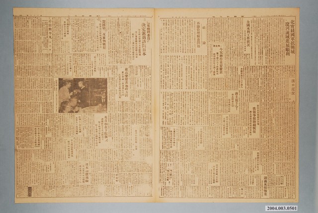 此為一紙質報紙,以黑色字體印刷,本物件為1945年(民國34年)11月26日發行之《臺灣新生報》第33號,此物件為單張雙面,共四版,內容計有〈臺灣省行政長官工署通告:署宣字第○○六○號〉、〈臺灣省行政長官公署農林處通告:農糧秘芳字第三號〉(處長趙連芳)、〈臺灣省行政長官公署交通處公告:交鐵字第七號〉(代處長陳清文)、〈台北市政府通告:工建字第四十六號〉(兼市長黃朝琴)、〈北甯綫國軍抵興城,遼河流域進展順利〉、〈全國水利工作狀況〉、〈蔣主席今天將作重要發表――關于國內目下經濟狀況,政府擬採取之種々措施〉、〈漢口近況〉(小魚)、〈在滬臺胞有六千餘人,同鄉會仍持續登記中〉、〈蔣主席手令:華北開發公司須系統化接收〉、〈荷印及其他南洋各地 我領事館陸續恢復 泗水僑胞我政府深為關切〉、〈北平行營設政務處,王捷三氏前往主持〉、〈偽聯鈔折合率核定 聯鈔五元合法幣一元 即日實行並定期收換〉、〈湖南災情慘重〉、〈近有糾察隊、公安隊不法干犯治安職權,臺北憲兵隊已奉命取締,今後再犯定當依法嚴懲 〉、〈江南造船廠巡禮――船塢機房大多破壞不堪,現有船艇十餘艘在修理〉、〈安置收復區中學生 教部決設臨時中學〉、〈社論:再論糧食管理問題〉、〈讀者投書:一地主籲請地主做模範〉(螢光)、〈遠東顧問委員會決定派員訪問日本:旨在研討管制日本實際問題,業已獲盟國最高統帥之同意,約在二三週內即可起程前往〉、〈盟國第二次審判戰犯:德發動侵略戰為審判中心,第三次大審判即日可舉行〉、〈原子能研究機械 麥帥命令日破壞〉、〈原子彈空中裝配〉、〈菲島明年可獨立〉、〈戴高樂發表施政方針:憲法會議一致通過信任案,共產黨亦決定協助新內閣〉、〈臺灣物價問題一對策〉(李○榮)、〈英首相在下院演說,謂國際安全在敦睦邦交,原子戰爭可使人類毀滅,原子管理計畫明年提出〉、〈杜博士:工在邦國,各界人士熱烈慶祝〉、〈金九返國抵達漢城,稱將商談黨派團結〉、〈日本物價飛漲――目前黑市食物價格較官價高出四十倍〉、〈非常與平凡〉(林紫貴)、〈英小學生崇敬我國,致書蔣夫人表敬意〉、〈社論:再び食糧管理問題を論ず〉、〈日本の戰爭暴利者,財產の七割を納稅――陸海軍將士,產業家等を包含〉、〈國軍,興城に到達 長城を越えと前進〉、〈原子爆彈の管理に 統制局設定を力說〉、〈現地を視察、打診 極東諮問委員 近く日本訪問〉、〈食糧等の輸入許可 日本の對外貿易復活〉、〈周民政局長嘉義へ〉、〈日本の原子研究終焉――マ元帥の指令で設施を完全に破壞〉、〈心生教育會支部發足〉、〈華北開發公司を接收〉、〈近く婦女參政運動を展開 嘉義市長、組織を慫恿〉、〈新政府めぐり:三民主義青年團の卷〉、〈日人陰謀團を檢舉 米軍占領の顛覆を企圖〉、〈米軍に協力甲入れ 朝鮮人民共和國派〉、〈杜博士の功績讚ふ 執教廿五周年慶祝大會〉、〈國民學院を創設〉、〈日本失敗の實況〉(宋斐如) 、〈新生臺灣のプロフィル わが新版圖に見入る都民〉等。 《臺灣新生報》創刊於1945年10月,是戰後初期由臺灣省行政長官公署宣傳委員會所經營的官方報刊,其前身為1944年,臺灣總督府整併島內六間報社所發行的《臺灣新報》。《臺灣新生報》最初由李萬居主導,雖屬官營報紙,但仍忠實反應民意,在二二八事件前夕,官民衝突漸深之際,新生報屢次發表告誡官方約束權力之言論。二二八事件之後,李萬居職權遭架空,辦報人員亦多被肅清,《臺灣新生報》成為更加偏向政府的報紙。 中華民國政府於1945年接收臺灣之始,即派出「中央宣傳部」整頓臺灣報業,撤廢日治時期管控報紙的許可制度,改為登記申請制,管制的解除使得戰後初期的辦報風氣大盛。後由於民間報刊對於接收後的行政長官公署多有批判,於是在二二八事件之後,政府開始嚴格控管報紙,在戒嚴開始後更以資源節約、端正文化等理由施行「報禁」。(王天濱,2002。154-170)