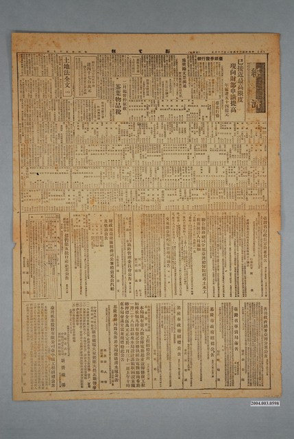 此為一紙質報紙,以黑色字體印刷,本物件為1947年(民國36年)1月26日發行之《臺灣新生報》第459號,此物件為單張單面,共兩版,內容計有〈臺中成立善後協會積極推行救濟工作,存糧漸少平糶辦法稍予修改,高雄市討論增聘救協委員〉、〈積極準備大赦工作,研討赦犯保護事宜,司法保護會進行各項調查〉、〈臺東專賣業務成績斐然可觀,數月來營業達四百餘萬元〉、〈區長慰問高山同胞,即組道路委會推行工作〉、〈精忠柏演義(十四)〉(鄭烈著)、〈臺灣省農產公司緊要啓事〉、〈臺灣醫療物品有限公司籌備處公告〉、〈臺灣電工業有限公司公告〉、〈已接近最高限度,現向財部申請提高年關達五十四億元〉、〈二月起暫停征收茶業物品稅〉、〈土地法全文(三)〉、〈臺灣省行政長官公署公告〉、〈聯合勤務總司令部臺灣總醫院招考土木工程暨統計人員通知〉、〈交通部臺灣郵電管理局通告〉、〈臺灣省行政長官公署交通處鐵路管理委員會公告〉、〈財政部臺南關稅務司公署標賣充公汽船及柴油公告〉、〈臺灣省日產處理委員會標售第五批日產企業公告〉、〈善後救濟總署臺灣分署公告〉、〈臺灣省專賣局佈告〉、〈基隆市政府招標公告〉、〈行政長官公署交通處高雄港務局工程招標公告〉、〈基隆港務局為花蓮港分局徵購潛水服公告〉、〈中國石油有限公司臺灣油礦探勘處新營礦場大量供應天然瓦斯啓事〉、〈臺灣紙業股份有限公司臺中廠工程招標公告〉等。 《臺灣新生報》創刊於1945年10月,是戰後初期由臺灣省行政長官公署宣傳委員會所經營的官方報刊,其前身為1944年,臺灣總督府整併島內六間報社所發行的《臺灣新報》。《臺灣新生報》最初由李萬居主導,雖屬官營報紙,但仍忠實反應民意,在二二八事件前夕,官民衝突漸深之際,新生報屢次發表告誡官方約束權力之言論。二二八事件之後,李萬居職權遭架空,辦報人員亦多被肅清,《臺灣新生報》成為更加偏向政府的報紙。 中華民國政府於1945年接收臺灣之始,即派出「中央宣傳部」整頓臺灣報業,撤廢日治時期管控報紙的許可制度,改為登記申請制,管制的解除使得戰後初期的辦報風氣大盛。後由於民間報刊對於接收後的行政長官公署多有批判,於是在二二八事件之後,政府開始嚴格控管報紙,在戒嚴開始後更以資源節約、端正文化等理由施行「報禁」。(王天濱,2002。154-170)