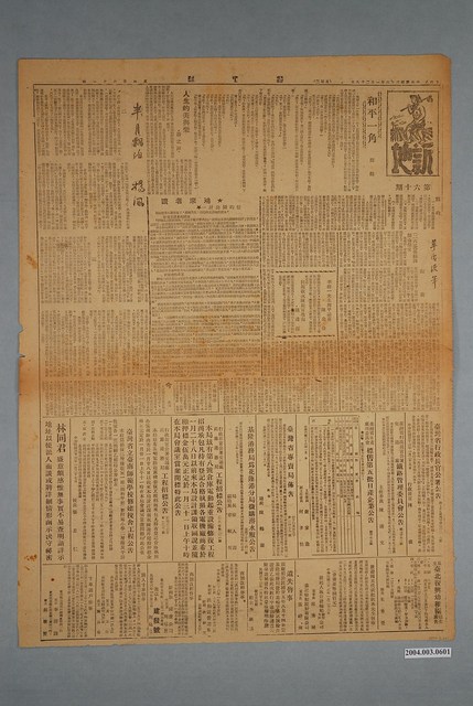 此為一紙質報紙,以黑色字體印刷,本物件為1947年(民國36年)1月28日發行之《臺灣新生報》第461號,此物件為單張單面,共兩版,內容計有〈各地憲法宣傳大會分別聘請國代演講〉、〈高雄市青年分團本年度工作計劃〉、〈倉庫守兵誤斃工人案 郭國基來省訪問長官〉、〈臺南度量衡工廠積極製造度量器設立度量衡檢定所於廠內〉、〈精忠柏演義(十六)〉(鄭烈著)、〈公署將與美國合辦設立大規模肥料廠,基隆人士陳請設于該市〉、〈省商會聯合會今選舉理事長〉、〈合作農場輔導員昨日起講習〉、〈和平一角〉(聞鶴)、〈人生的美與樂〉(湯之屏)、〈半月飄泊〉(楊風)、〈一封公開的信〉、〈臺灣省行政長官公署公告〉、〈臺灣省行政長官公署交通處鐵路管理委員會公告〉、〈臺灣省日產處理委員會標售第五批日產企業公告〉、〈臺灣省專賣局佈告〉、〈基隆港務局為花蓮港分局徵購潛水服公告〉、〈行政長官公署交通處高雄港務局工程招標公告〉、〈臺灣省立臺南師範學校修建校舍工程公告〉等。 《臺灣新生報》創刊於1945年10月,是戰後初期由臺灣省行政長官公署宣傳委員會所經營的官方報刊,其前身為1944年,臺灣總督府整併島內六間報社所發行的《臺灣新報》。《臺灣新生報》最初由李萬居主導,雖屬官營報紙,但仍忠實反應民意,在二二八事件前夕,官民衝突漸深之際,新生報屢次發表告誡官方約束權力之言論。二二八事件之後,李萬居職權遭架空,辦報人員亦多被肅清,《臺灣新生報》成為更加偏向政府的報紙。 中華民國政府於1945年接收臺灣之始,即派出「中央宣傳部」整頓臺灣報業,撤廢日治時期管控報紙的許可制度,改為登記申請制,管制的解除使得戰後初期的辦報風氣大盛。後由於民間報刊對於接收後的行政長官公署多有批判,於是在二二八事件之後,政府開始嚴格控管報紙,在戒嚴開始後更以資源節約、端正文化等理由施行「報禁」。(王天濱,2002。154-170)