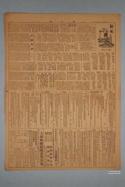 此為一紙質報紙,以黑色字體印刷,本物件為1947年(民國36年)5月6日發行之《臺灣新生報》第558號,此物件為單張單面,共兩版,內容計有〈高雄煉油廠已開工,今後分期積極建設,第一期日煉原油八千桶〉、〈大批糧食上市,米價漸趨下游〉、〈發展本省沿海漁業,基隆設漁船修造廠,水產公司積極擴展業務〉、〈適應各地需要請求,央行發行一萬元券,經通告全球金融機關〉、〈長春物價普遍上揚〉、〈客幫納胃甚佳,紗布食糖價挺〉、〈臺糖行政機構應有的改革〉(楊逸農)、〈臺灣省行政長官公署公告〉、〈高雄縣政府標賣公告〉、〈臺灣水泥有限公司工程招標公告〉、〈關於莎士比亞〉(蘭馬)、〈交友談〉、〈法國的酒〉(王益之)、〈師院點滴〉(毛文昌)、〈我的少女〉(杜錫基)、〈電影和兒童〉、〈行政長官公署農林處農田水利局工程招標公告〉、〈交通部臺灣郵電管理局通告〉、〈臺北市政府公告〉、〈財政部臺北關稅務司公署佈告〉、〈臺灣省基隆市警察局警察服裝招標公告〉、〈臺灣省貿易局舉辦配銷物品承銷商登記公告〉、〈臺灣省貿易局標售臺灣纖維製品統制會社及織物什貨卸商組合存貨公告〉、〈中國國民黨臺灣省黨部通告〉、〈臺灣省日僑管理委員會公告〉、〈臺中縣警察局公告〉、〈臺灣電力公司公告〉、〈臺灣省專賣局酒業有限公司招標大麥及木箱展期公告〉、〈臺灣工礦股份有限公司辦理接管各會社已登記之舊股票換認新股或退股還款公告〉、〈臺灣紙業有限公司臺中廠工程招標公告〉、〈清算臺灣パルブ工業株式會社啓事〉等。 《臺灣新生報》創刊於1945年10月,是戰後初期由臺灣省行政長官公署宣傳委員會所經營的官方報刊,其前身為1944年,臺灣總督府整併島內六間報社所發行的《臺灣新報》。《臺灣新生報》最初由李萬居主導,雖屬官營報紙,但仍忠實反應民意,在二二八事件前夕,官民衝突漸深之際,新生報屢次發表告誡官方約束權力之言論。二二八事件之後,李萬居職權遭架空,辦報人員亦多被肅清,《臺灣新生報》成為更加偏向政府的報紙。 中華民國政府於1945年接收臺灣之始,即派出「中央宣傳部」整頓臺灣報業,撤廢日治時期管控報紙的許可制度,改為登記申請制,管制的解除使得戰後初期的辦報風氣大盛。後由於民間報刊對於接收後的行政長官公署多有批判,於是在二二八事件之後,政府開始嚴格控管報紙,在戒嚴開始後更以資源節約、端正文化等理由施行「報禁」。(王天濱,2002。154-170)